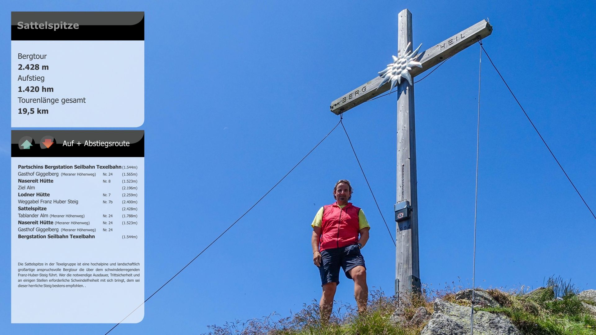 Die Sattelspitze in der Texelgruppe ist eine hochalpine und landschaftlich großartige anspruchsvolle Bergtour die über dem schwindelerregenden Franz-Huber-Steig führt. Wer die notwendige Ausdauer, die Trittsicherheit und an einigen Stellen erforderliche Schwindelfreiheit mit sich bringt, dem sei dieser herrliche Steig bestens empfohlen..