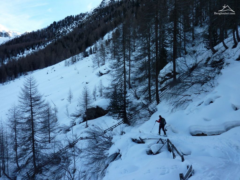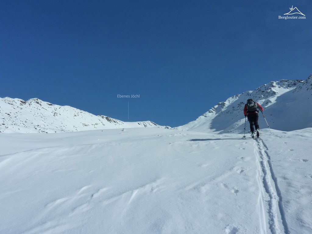 Die Skitour zum Ebenen Jöchl (2.786 m) bietet eindrucksvolle Blicke auf den Zufritt-Stausee , Tal auswärts auf das ganze Martelltal sowie zu den Marteller Bergbauernhöfen.